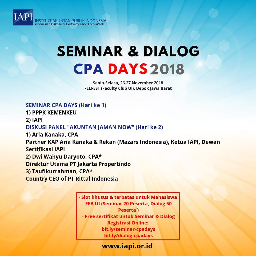 Humas Febui Auf Twitter Institut Akuntan Publik Indonesia Iapi Akan Menyelenggarakan Acara Cpa Days 2018 Pada Tgl 26 27 November 2018 Di Felfest Faculty Club Universitas Indonesia Depok Https T Co Yt4yaqpz9m Twitter