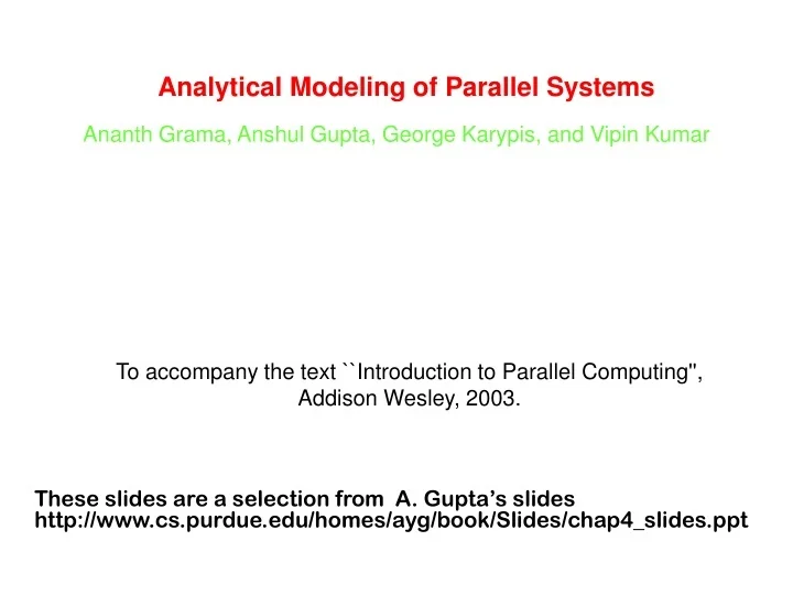 Lafayette IN 47906 aygcspurdueedu Anshul Gupta IBM TJ. Analytical Modeling of Parallel Systems Ananth Grama Anshul Gupta George Karypis and. Ananth Grama George Karypis Vipin Kumar Anshul Gupta - Introduction to parallel computing-Addison Wesley 2003 Peter Pacheco - An Introduction to Parallel Programming-Morgan Kaufmann 2011 Undergraduate Topics in Computer Science Roman Trobec Boštjan Slivnik Patricio Bulić Borut Robič - Introduction to Parallel Computing_ From Algorithms to.