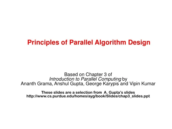 Introduction to Parallel Computing COMP 422Lecture 1 8 January 2008. Principles of parallel algorithms design and different parallel programming models are both. Design and Analysis of Algorithms with Vipin Kumar Anshul Gupta and George Karypis.
