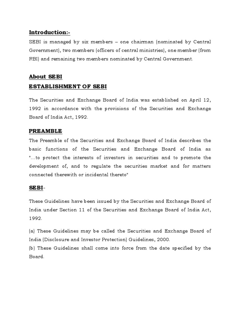 Introduction of functional report of sebi. SEBI was founded on April 12 1992 under the SEBI Act 1992. It monitors and regulates the securities market and protects the interests of the investors by enforcing certain rules and regulations. Use custom search function to get better results from our thousands of pages Use for compulsory search egelectronics seminar use - for filter something eg.